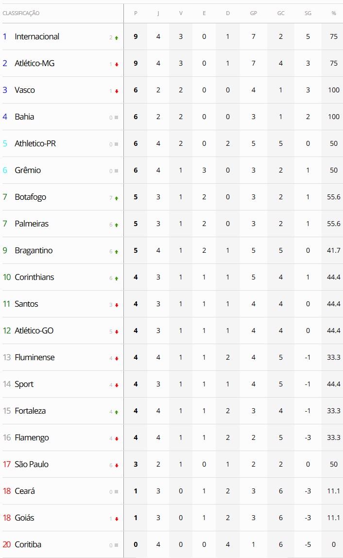 O resultados desta 4ª-feira pela 4ª rodada do Campeonato Brasileiro (com destaque para a derrota do até então líder Atlético-MG) deixaram o Vasco na 3ª colocação na tabela, porém com chance de chegar à liderança nesta 5ª-feira mesmo com um jogo a menos do que a maioria de seus adversários. Para isso, o Gigante da Colina precisa vencer o Ceará por pelo menos 3 gols de diferença e torcer para o Bahia, que visita o São Paulo, perder, empatar ou vencer no máximo por 3 gols de diferença.