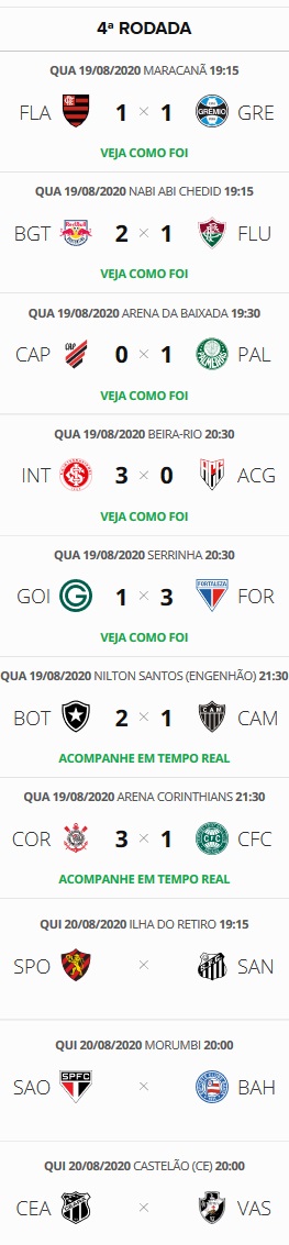 Resultados desta 4ª deixam o Vasco em 3º no Brasileiro, podendo virar líder nesta 5ª mesmo com 1 jogo a menos
