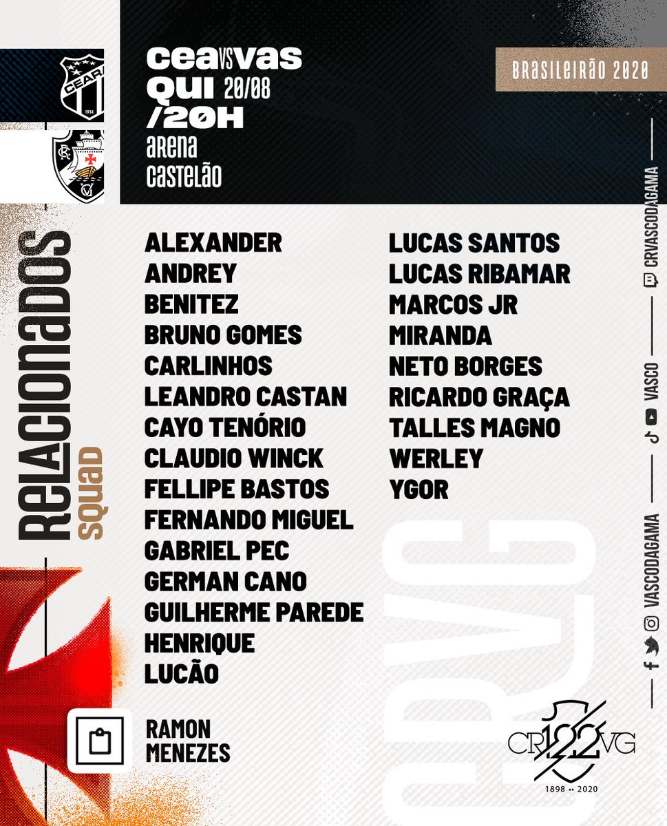 Confira os relacionados do Vasco para o jogo contra o Ceará; Ygor Catatau é a novidade