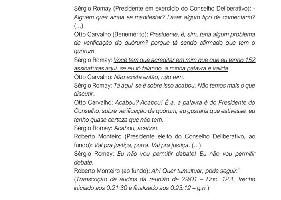 A ação também questiona - e acusa arbitrariedade da "mesa do Conselho Deliberativo" - a mudança das redações finais de atas das reuniões - caso do trecho sobre regras de anistia (os autores citam o artigo 35, parágrafo terceiro, que dizia "após o primeiro ano de cada mandato fica expressamente vedada a concessão de anistia" para "anistia só poderá ser concedida no último ano do mandato vigente"); outro sobre a competência do Conselho de Beneméritos ("aprovar ou não a outorga de título de sócios Eméritos e Beneméritos apresentado pelo Presidente do Clube, Presidente do Conselho Deliberativo..." para "recomendar ou não a outorga...".