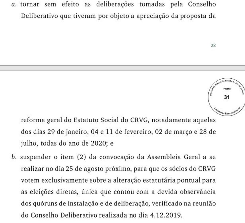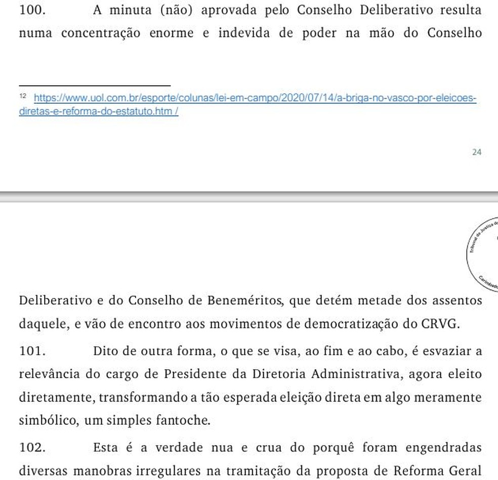 O processo de Carlos Fonseca, Bruno Iglesias e Maurício Corrêa, da "Mais Vasco", que tem o empresário Jorge Salgado como pré-candidato, é de ação de declaração de nulidade com pedido de tutela provisória de urgência. Ainda não houve decisão na ação, que corre no Tribunal de Justiça do Estado do Rio de Janeiro. Os autores da ação anexaram ao processo áudios e a transcrição deles com trechos das últimas reuniões. Com isso, contestam o quórum apropriado (chamam de "quórum flutuante" durante as votações) para reforma ou alteração estatutária - de acordo com a lei maior do Vasco, estes casos precisam de quórum qualificado (2/3 do Conselho Deliberativo presentes).