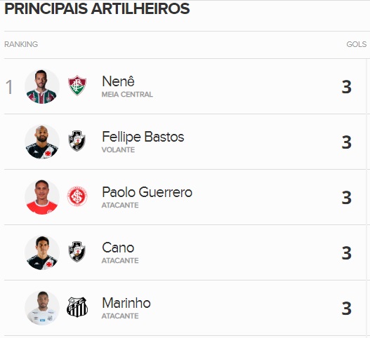 Com 3 gols marcados, os vascaínos Germán Cano e Fellipe Bastos dividem a artilharia do Brasileiro com Nenê, Guerrero e Marinho.