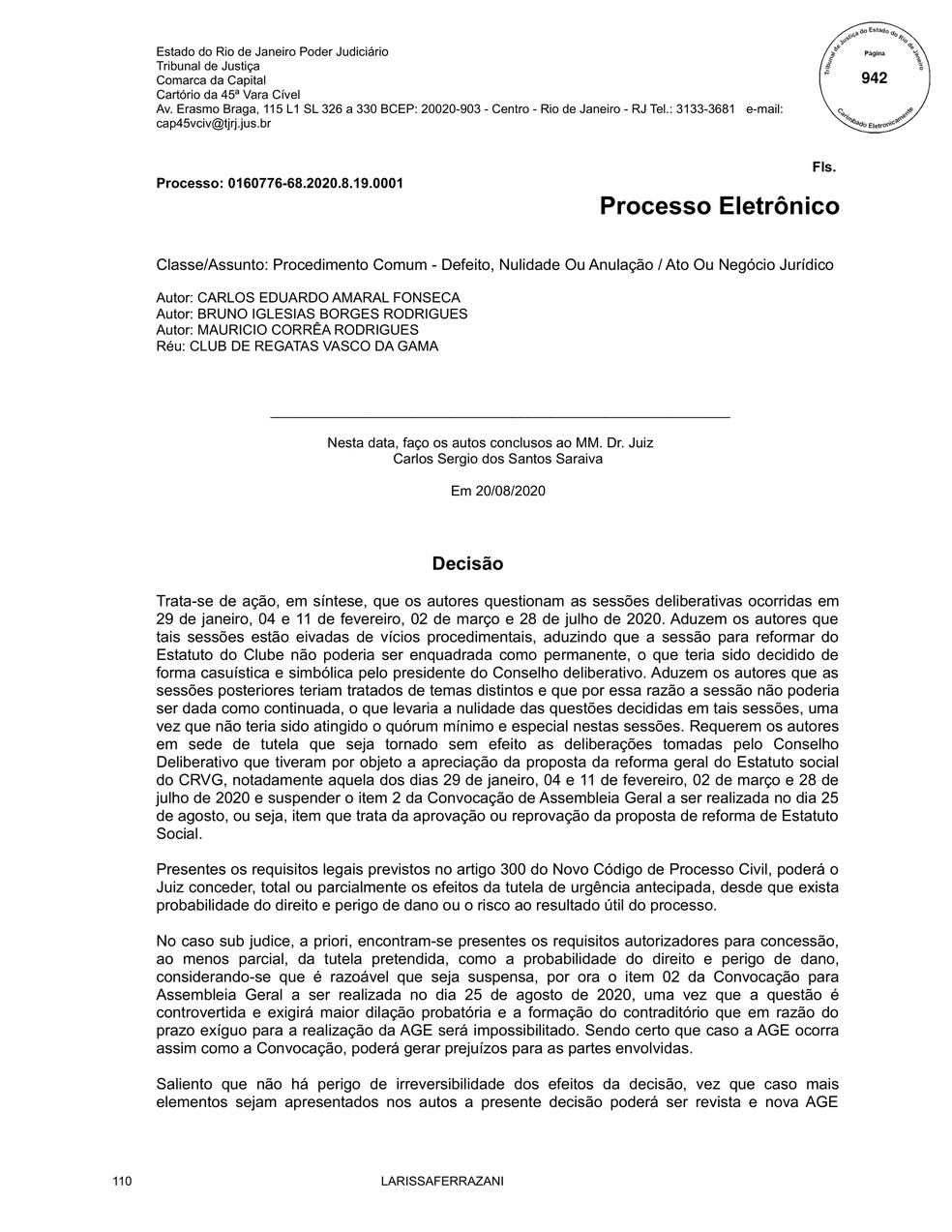 O Vasco tem novo capítulo referente à Assembleia Geral Extraordinária que foi marcada para a próxima terça-feira, quando seriam votadas tanto a adoção de eleições diretas quanto a reforma estatutária. Em decisão assinada pelo juiz Carlos Sergio dos Santos Saraiva, nesta sexta-feira, o item que trata da reforma do estatuto foi retirado da pauta.
