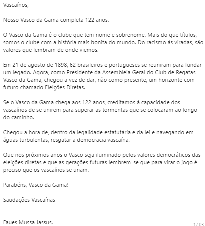 Olha aí a mensagem de aniversário pelos 122 anos do Vasco enviada por Faues Cherene Jassus, o Mussa, a todos os vascaínos. O presidente da Assembleia Geral Extraordinária do clube nos mandou a mensagem via Whatsapp. #gevas