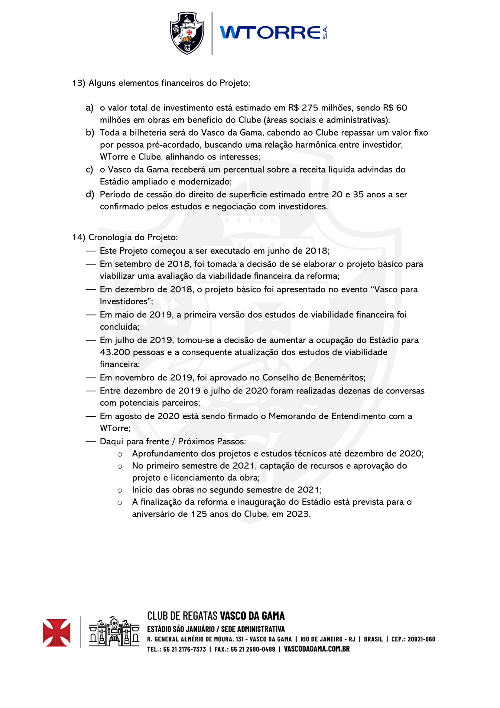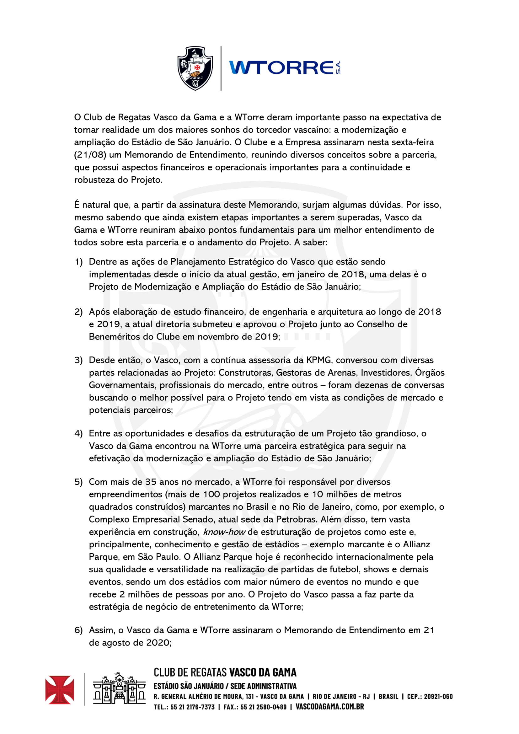 Confira detalhes sobre o início da parceria entre o Vasco e a WTorre clicando aqui.
