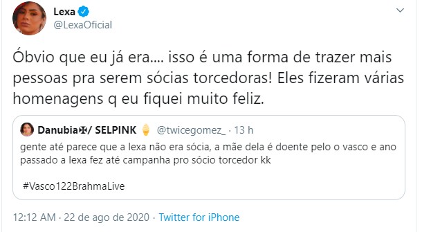 Presenteada por Campello em live, Lexa esclarece que já era sócia-torcedora do Vasco