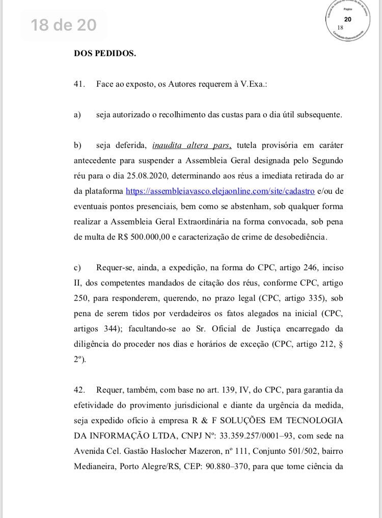 Jose Manuel Blanco Pereira, um dos autores da ação, é do grupo "Identidade Vasco". Ele e outra sócia do clube, Aline Bento de Souza Cardoso, foram representados pelos advogados Wadih Damous, ex-presidente da OAB-RJ e ex-deputado federal (PT-RJ), antigo apoiador do presidente da Assembleia Geral do Vasco, Roberto Monteiro. O outro advogado é Mauro Abdon Gabriel, um dos membros da comissão de reforma do estatuto do clube. Esta, por enquanto, suspensa para a votação online da Assembleia Geral do Vasco.