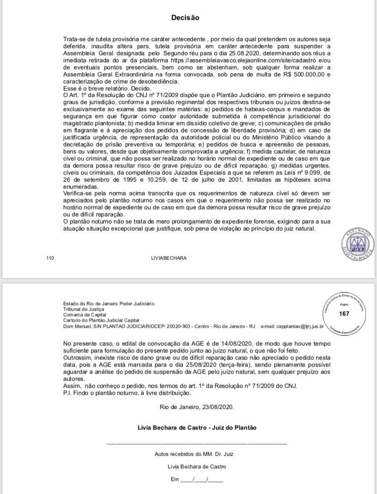 A Juíza de Plantão Lívia Bechara de Castro, do Tribunal de Justiça do Rio de Janeiro, não acolheu um pedido de suspensão da Assembleia Geral Extraordinária do Vasco, que tem data marcada para a próxima terça-feira (25). Na decisão, a magistrada afirmou que o caso não deve ser apreciado em plantão noturno e que, portanto, o mérito deve ser julgado por outro magistrado a ser sorteado.