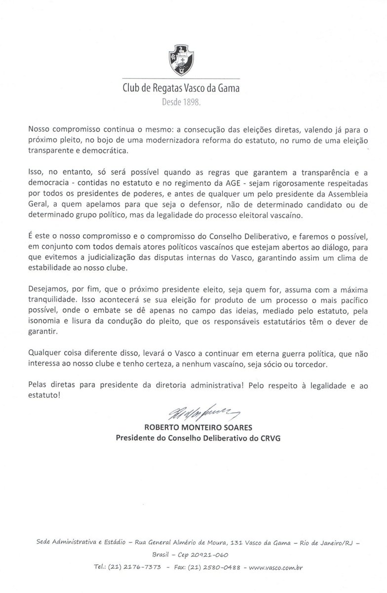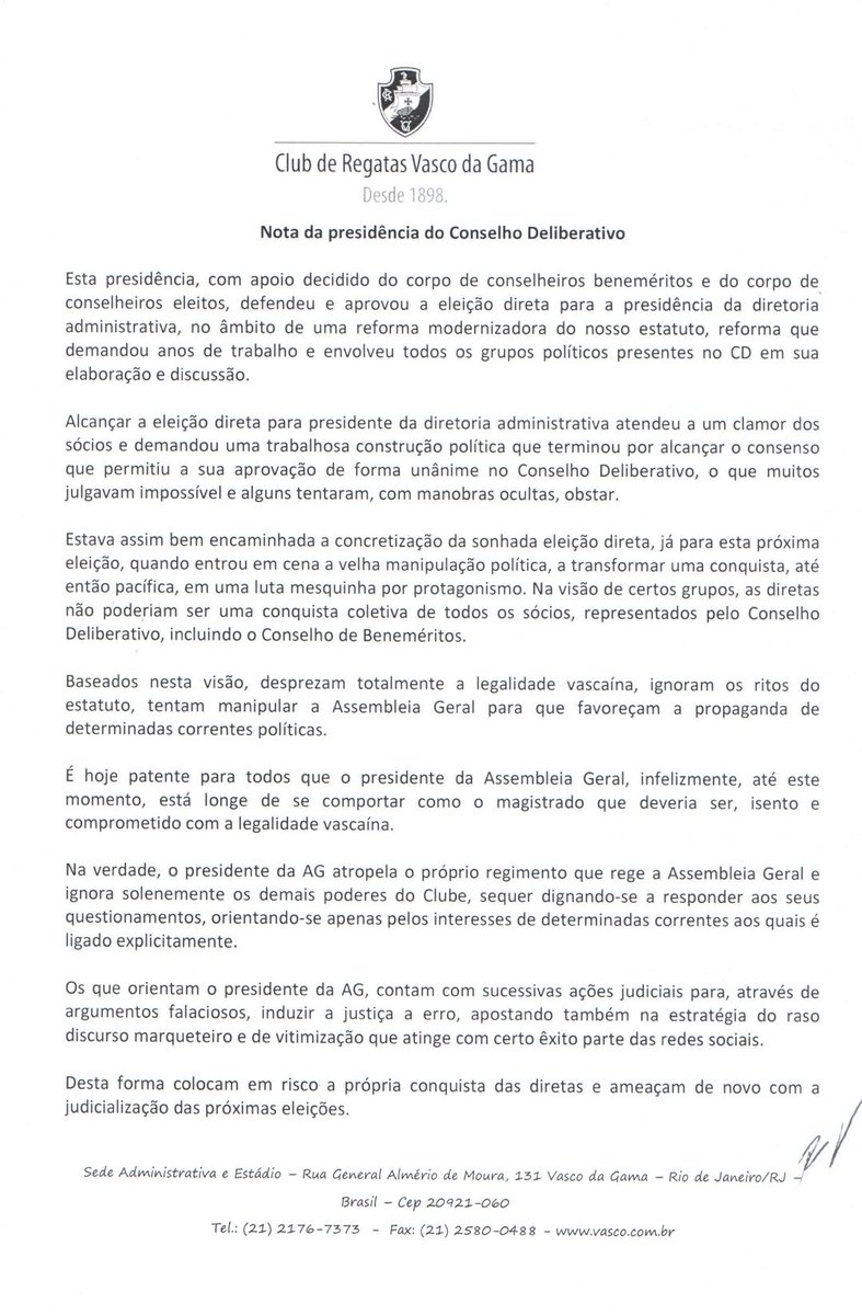 "É hoje patente para todos que o presidente da Assembleia Geral, infelizmente, até este momento, está longe de se comportar como o magistrado que deveria ser, isento e comprometido com a legalidade vascaína.