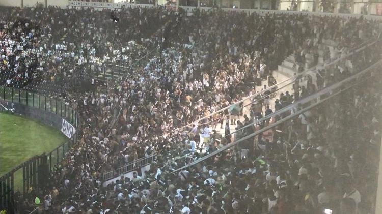 No fim do segundo tempo, boa parte do estádio passou a xingar o presidente do clube, Alexandre Campello. Em seguida, o UOL Esporte flagrou em vídeo (a partir dos 18 segundos acima) um grupo saindo do lado esquerdo em direção à organizada que fica atrás do gol e iniciando a confusão, que teve agressões e instrumentos atirados indiscriminadamente em direção ao público que corria, não se importando nem mesmo com mulheres e crianças que estavam na aglomeração.