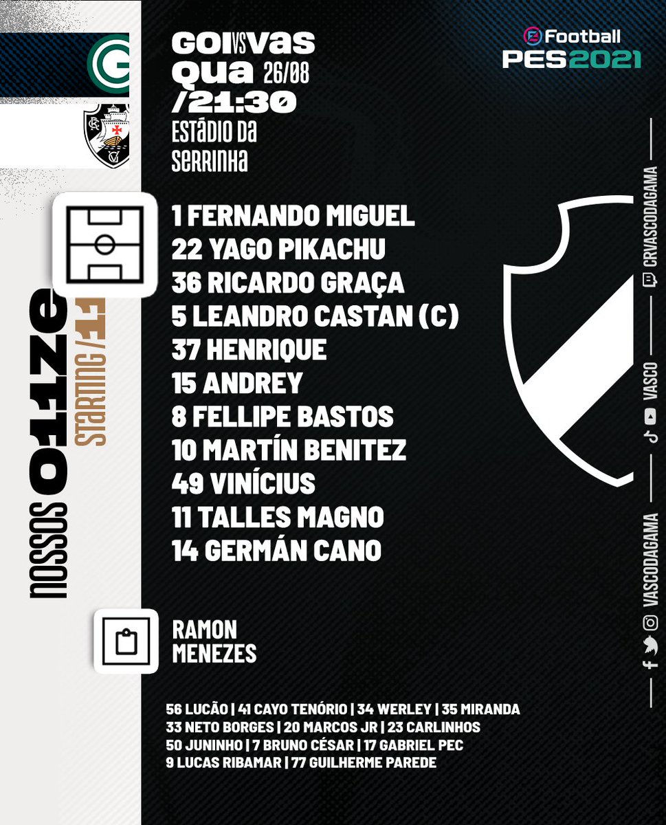 Confira a escalação do Vasco para o jogo contra o Goiás; Yago Pikachu e Vinícius são as novidades