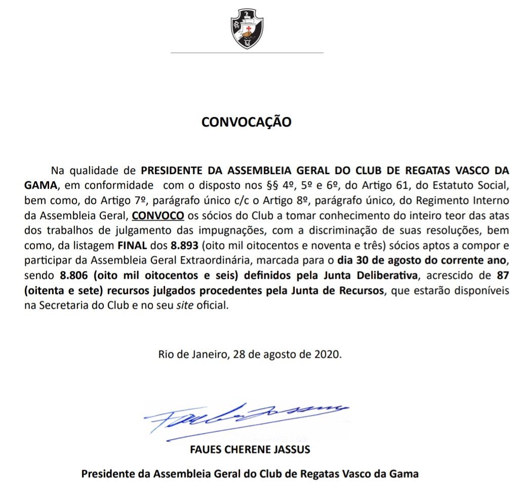 Nota da NETVASCO: Veja a íntegra da convocação, com a lista dos sócios, clicando aqui.