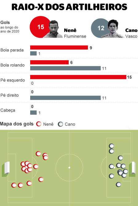 Apesar da pontaria afiada, há muitas diferenças na forma como cada um cumpre sua função. A começar pelo posicionamento. Centroavante, Cano é o homem mais à frente. Já Nenê, por ser meia, flutua por trás dos atacantes. Embora pareça óbvia, essa distinção se reflete no setor do campo onde cada um é mais perigoso. Todos os gols do argentino em 2020 saíram de finalizações de dentro da grande área. Já os do armador são mais distribuídos: 10 foram marcados na área e 5 saíram de finalizações no entorno da meia lua.