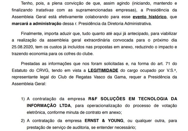 Com vitórias na Justiça que confirmavam a Assembleia Geral Extraordinária deste domingo, Mussa indicou duas empresas pré-contatadas. A Eleja Online para a realização da votação virtual e a Ernst Young "ou qualquer outra" para prestação de serviço de auditoria, se (a diretoria) entender necessário".