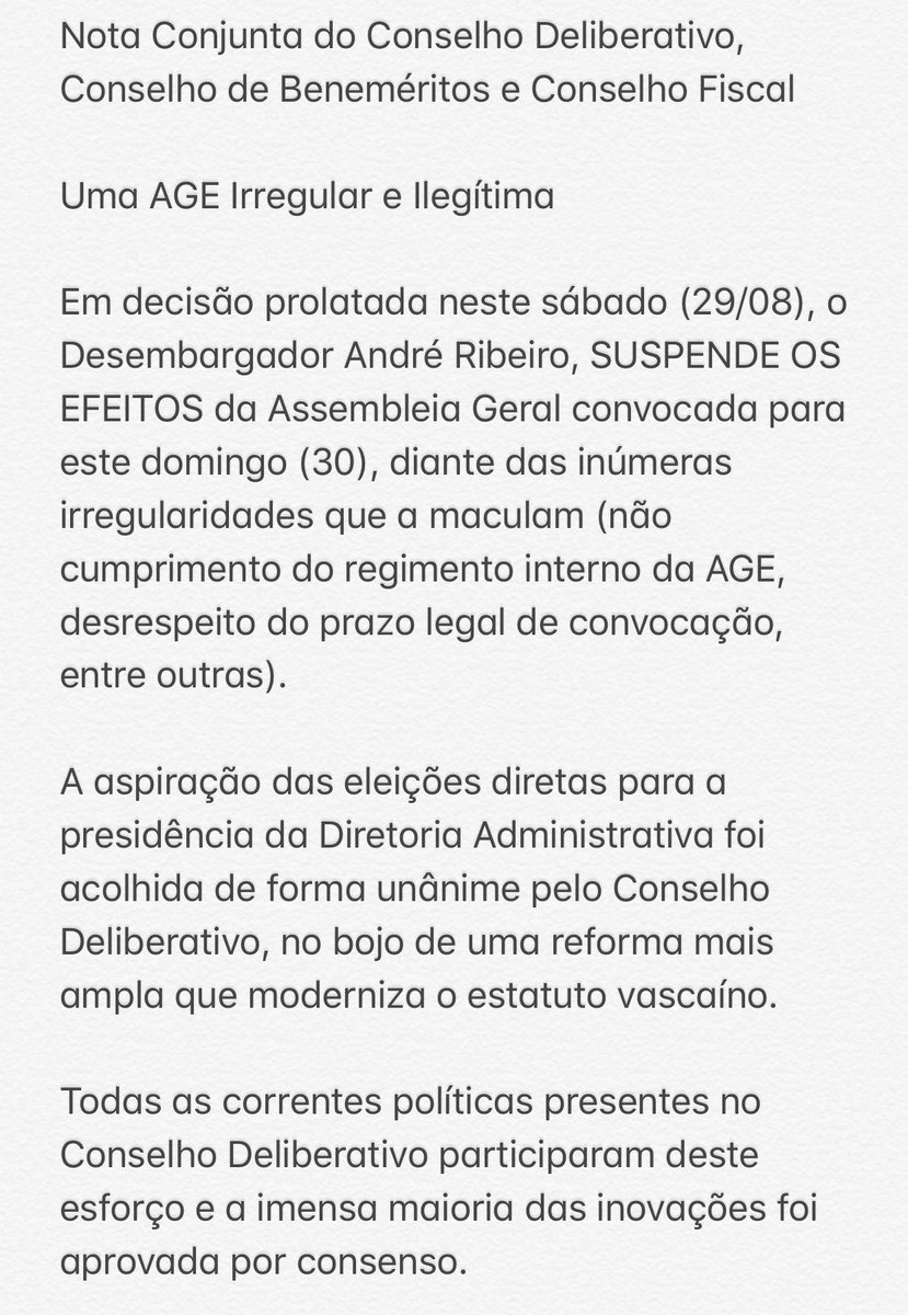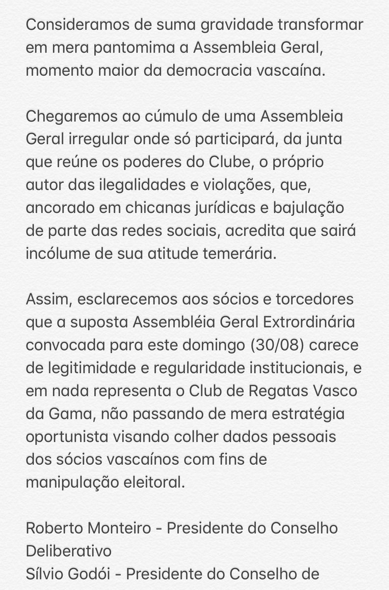 Conselhos Deliberativo, Fiscal e de Beneméritos do Vasco divulgam nota conjunta sobre a AGE deste domingo