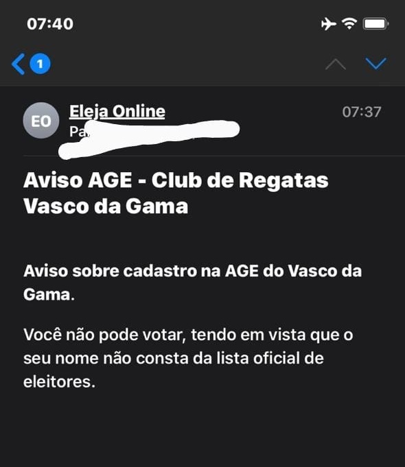 Vascaínos que se cadastraram no site Eleja Online, mas não estão na lista divulgada pela junta eleitoral, receberam este e-mail logo no começo do dia. #VascoENM