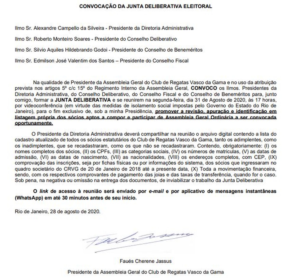 Em meio a brigas que envolvem diversas ações judiciais, o presidente da Assembleia Geral do Vasco, Faues Cherene Jassus, o Mussa, convocou para esta segunda-feira, às 17h, a primeira reunião da Junta deliberativa, que deve "revisar, apurar e identificar listagem própria dos sócios aptos a compor e participar de Assembleia Geral Ordinária".