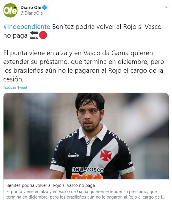 Jornal argentino Olé especula possível volta de Benítez ao Independiente 'se o Vasco não paga'
