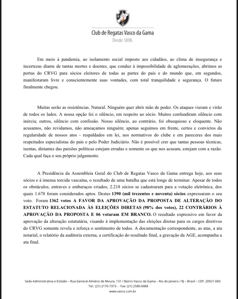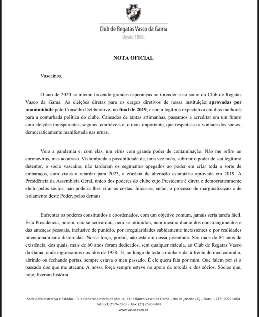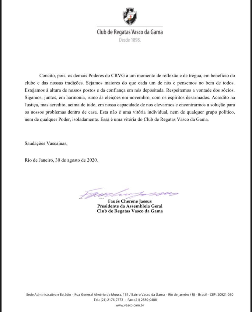Mussa, na nota em que comunicou resultado da AGE: 'Essa é uma vitória do Club de Regatas Vasco da Gama'