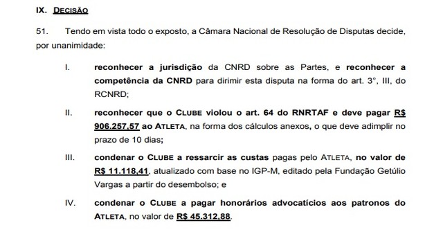A decisão dele ocorreu por um motivo simples: obteve sentença favorável na Câmara Nacional de Resolução de Disputas (CNRD), na qual processou o Vasco pelo mesmo motivo. Na sentença datada de 29 de maio, o órgão que arbitra conflitos entre agentes do futebol brasileiro determinou o pagamento de R$ 906 mil.