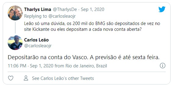 Depositarão na conta do Vasco. A previsão é até sexta feira.