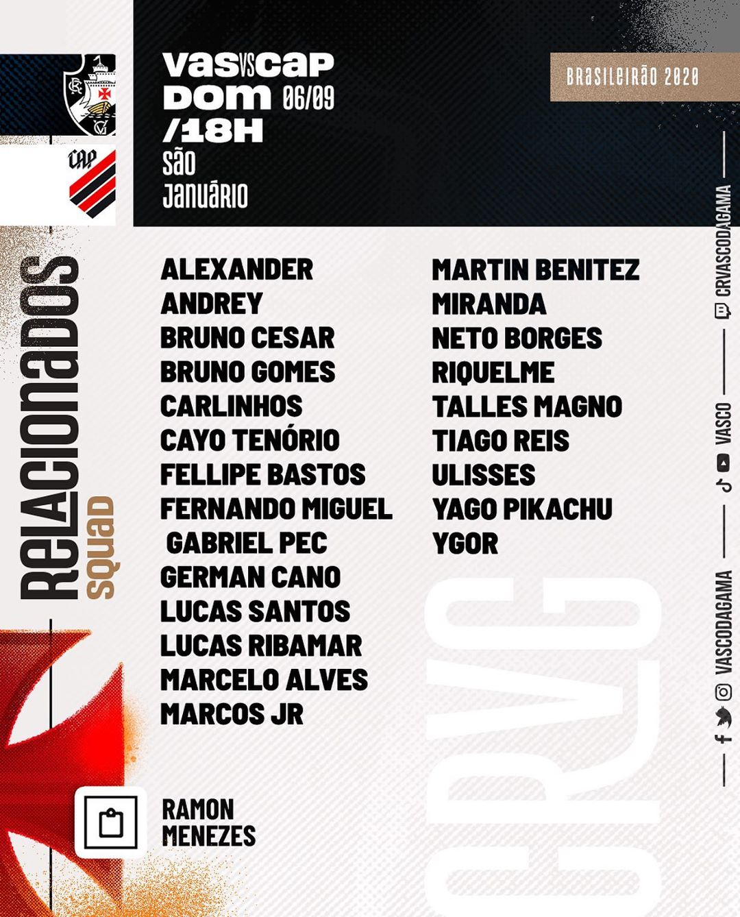 Confira os relacionados do Vasco para o jogo contra o Athletico-PR; Castan segue poupado
