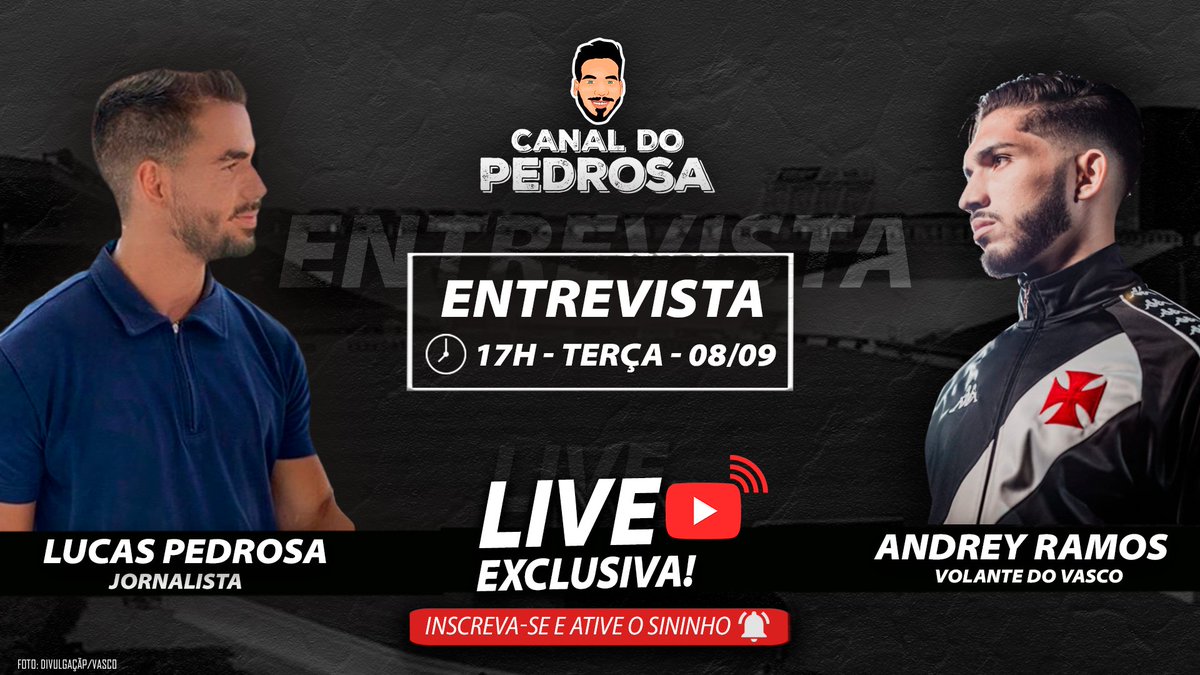 Como anunciamos no 'Pedrosa Responde #1', @AndreyRamos98 vai ser o primeiro jogador entrevistado no #CanaldoPedrosa! A Live vai começar às 17h desta terça-feira (08). Espero todos por lá para prestigiar um dos melhores jogadores do Vasco em 2020. Vem: https://t.co/p9rQP9q7R1