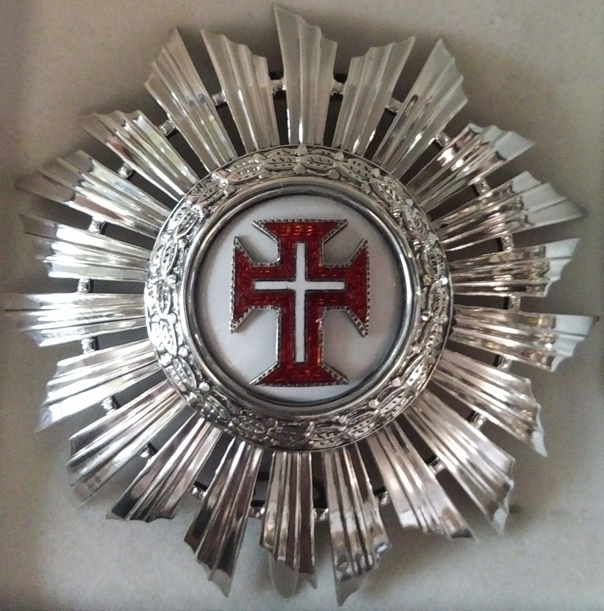 O distintivo da Ordem Militar de Cristo é uma cruz latina, pátea, de esmalte vermelho, perfilada de ouro, carregada de cruz latina de esmalte branco.