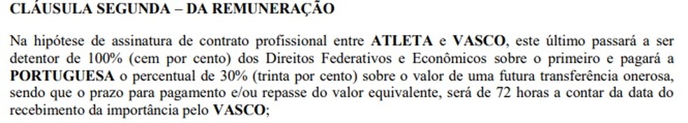 Em matéria publicada pelo ge no ano passado, foi revelada a reclamação da Lusa. Obtido com exclusividade pelo ge, o contrato em papel timbrado enviado pelo jurídico do Vasco traz na cláusula segunda o seguinte: "Na hipótese de assinatura de contrato profissional entre ATLETA e VASCO, este último passará a ser detentor de 100% (cem por cento) dos Direitos Federativos e Econômicos sobre o primeiro e pagará a PORTUGUESA o percentual de 30% (trinta por cento) sobre o valor de uma futura transferência onerosa, sendo que o prazo para pagamento e/ou repasse do valor equivalente, será de 72 horas a contar da data do recebimento da importância pelo VASCO".