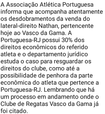 Sobre Nathan. Há pouco entrei em contato com a assessoria da Portuguesa-RJ, para saber sobre esse imbróglio com o Vasco, já que a lusa alega ter direito a 30% dos direitos econômicos do atleta numa possível transferência. Segue o posicionamento oficial do clube.