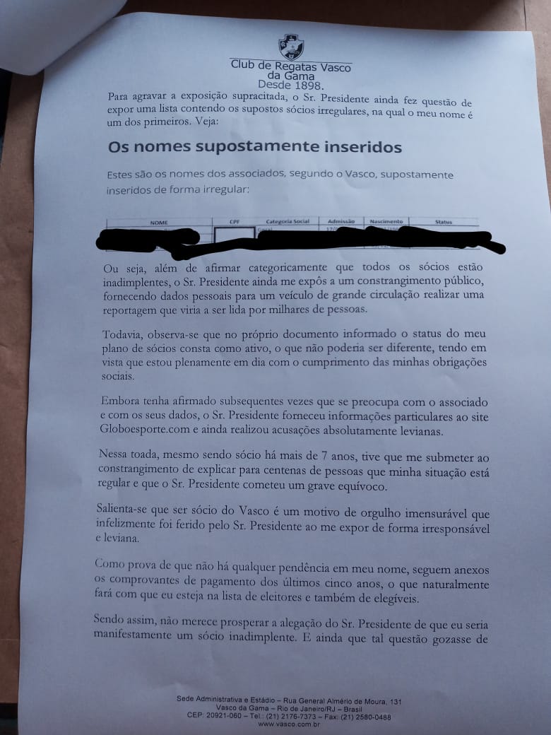 Entendemos que a melhor forma de resolver os problemas do Vasco seja internamente, pelas vias administrativas. Por isso, protocolamos uma notificação extrajudicial na secretaria, contendo todos os comprovantes de pagamento do membro desde 2015 (mesmo sendo eleitor em 14 e 17)