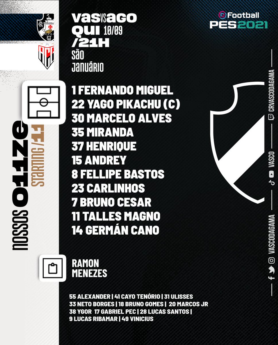Confira a escalação do Vasco para o jogo contra o Atlético-GO; Carlinhos e Bruno César são titulares e Vinícius começa no banco