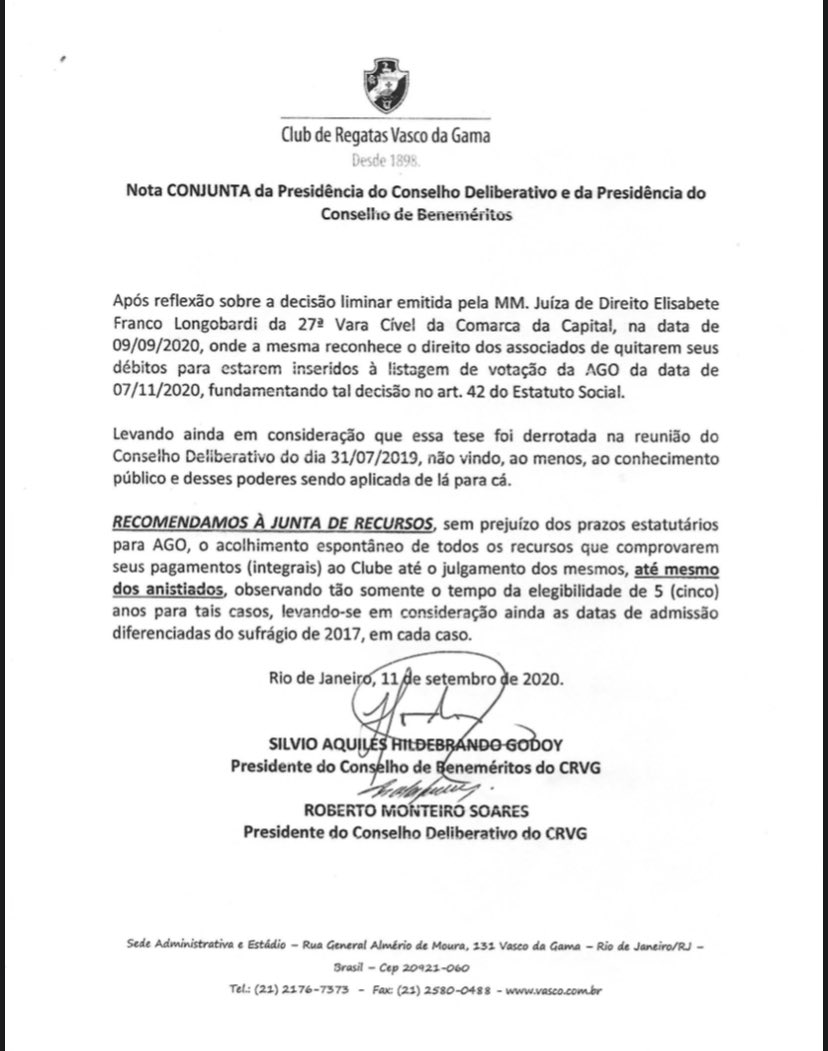 Roberto Monteiro, presidente do Conselho Deliberativo, e Silvio Godoi, presidente do Conselho de Beneméritos, divulgaram uma nota conjunta pedindo à Junta Recursal para adicionar os sócios que comprovarem os pagamentos ao Vasco à lista de votantes nas eleições ordinárias ??