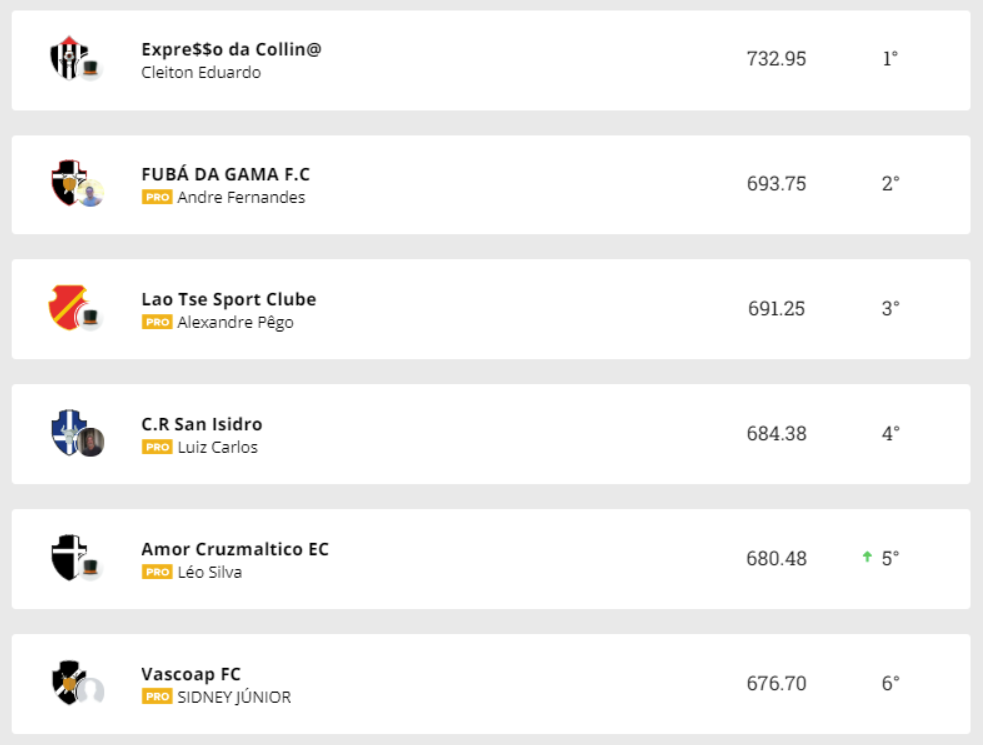 31/08/20 - Cartola FC: Confira a classificação da Liga NETVASCO após a 6ª rodada