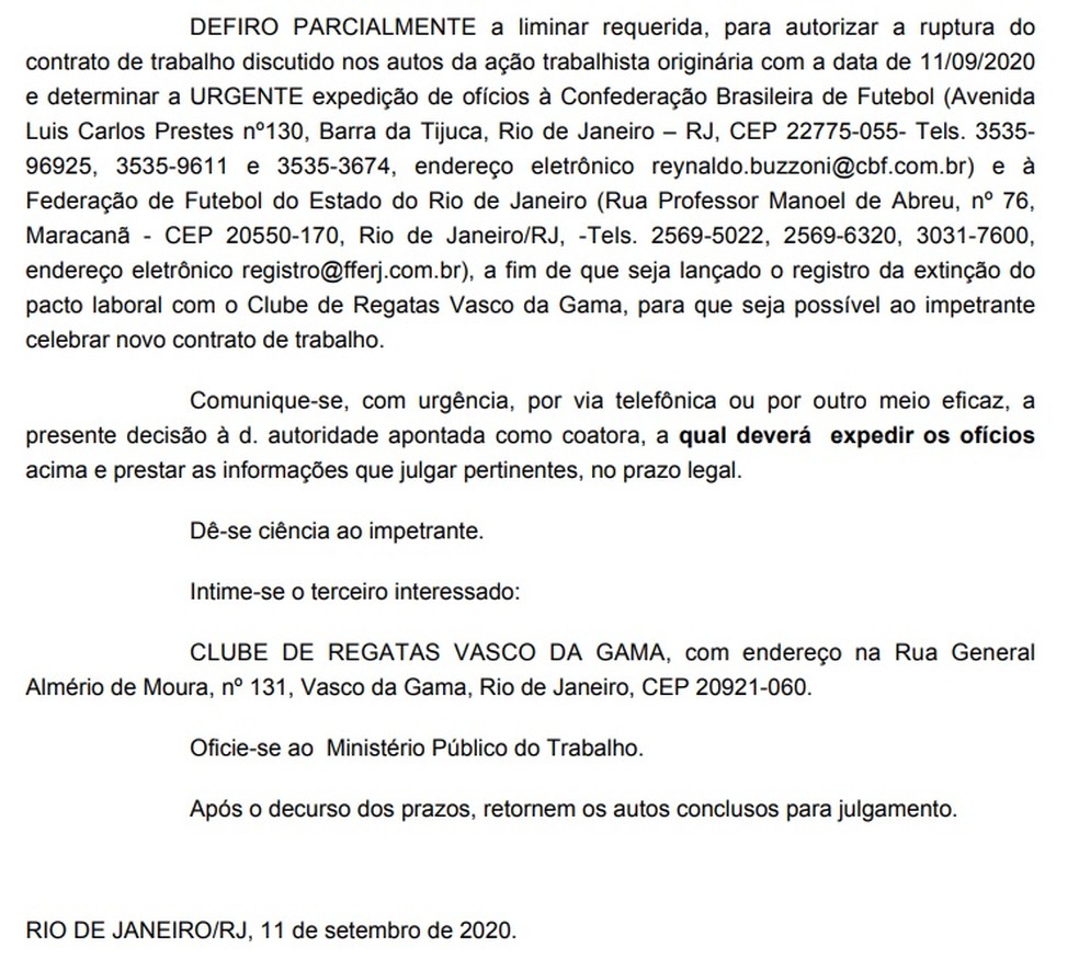 Galhardo é representado pela advogada Ana Paula Belinger, que impetrou mandado de segurança após a primeira instância ter negado a rescisão. Com a decisão judicial, o atleta fica livre para assinar com qualquer outro clube. Ele tinha contrato com o Vasco até o dia 9 de janeiro de 2021.