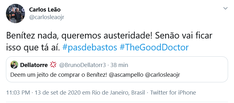 VP de finanças Carlos Leão ironiza ao ser cobrado para comprar Benítez: 'Benítez nada, queremos austeridade! Senão vai ficar isso que tá aí'