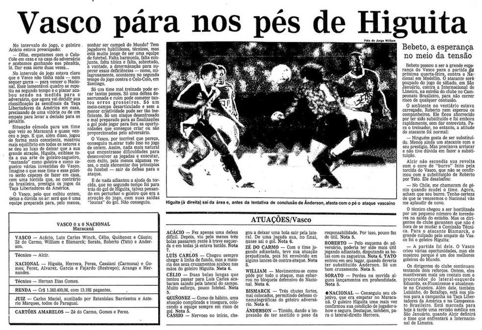 Vasco e Atlético Nacional fizeram três jogos em 23 dias naquelas quartas de final. No Maracanã, empate por 0 a 0, dia 22 de agosto. Em Medellín, vitória colombiana por 2 a 0, dia 29 de agosto. Finalmente, em Santiago, os colombianos levaram a melhor por 1 a 0, no dia 13 de setembro de 1990