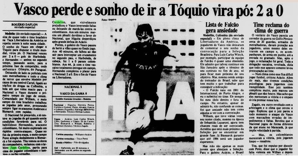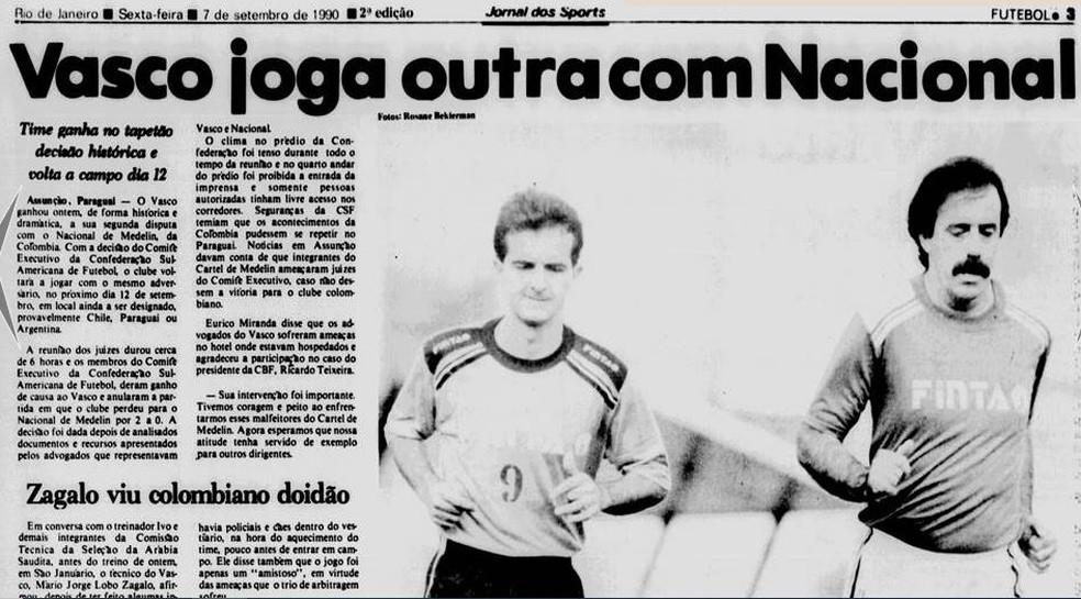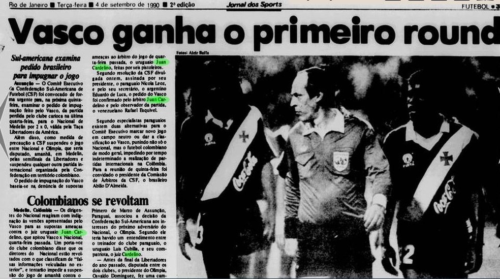 Fatos, fakes e muita história para contar resumem o jogo anulado entre Atlético Nacional e Vasco pelas quartas de final da Libertadores de 1990. Um confronto que começou no campo, em Medellín, passou pelo tribunal da confederação sul-americana em Assunção, no Paraguai, e só terminou com partida remarcada e vitória colombiana sobre os brasileiros (1 a 0) em Santiago, no Chile, dia 13 de setembro de 1990.