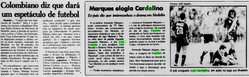 Ex-dirigente e representante até 2017 de clubes na Conmebol, Hildo Nejar é outra testemunha do que se passava em Medellín. Na ocasião, o presidente da confederação sul-americana, Nicolas Leóz, o enviou como observador da partida. As denúncias envolvendo intimidações e coações em jogos na Colômbia se acumulavam. Um ano antes, o árbitro Álvaro Ortega havia sido assassinado, em Medellín, em 1989, em morte ligada a apostadores e ao tráfico. O campeonato local foi cancelado após o trágico incidente.