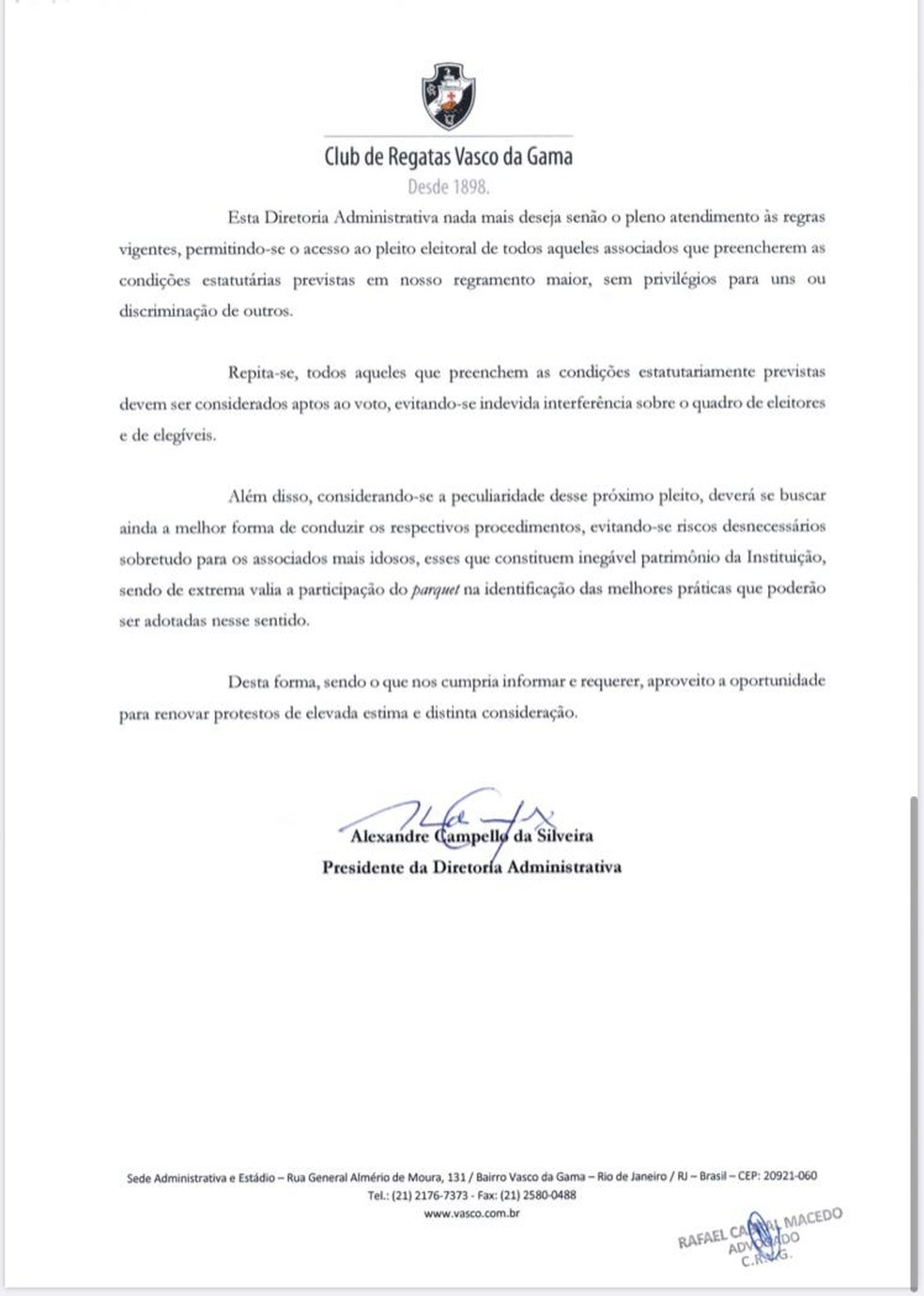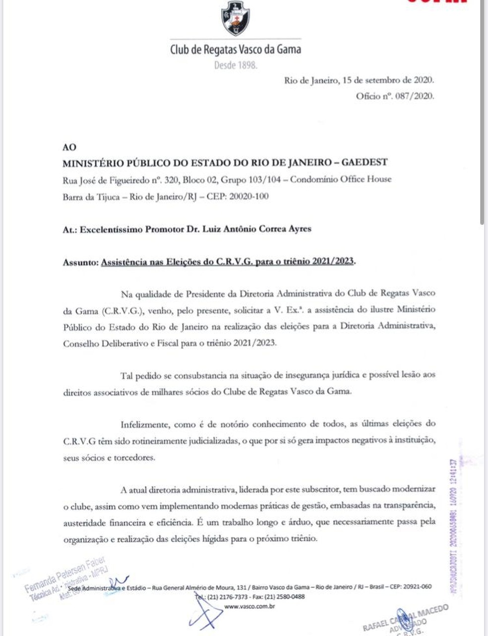 O presidente Alexandre Campello protocolou nesta quarta-feira um pedido para que o Ministério Público do Rio de Janeiro auxilie na realização das eleições do Vasco, marcada para 7 de novembro. O dirigente confirmou oficialmente nessa semana que tentará a reeleição.