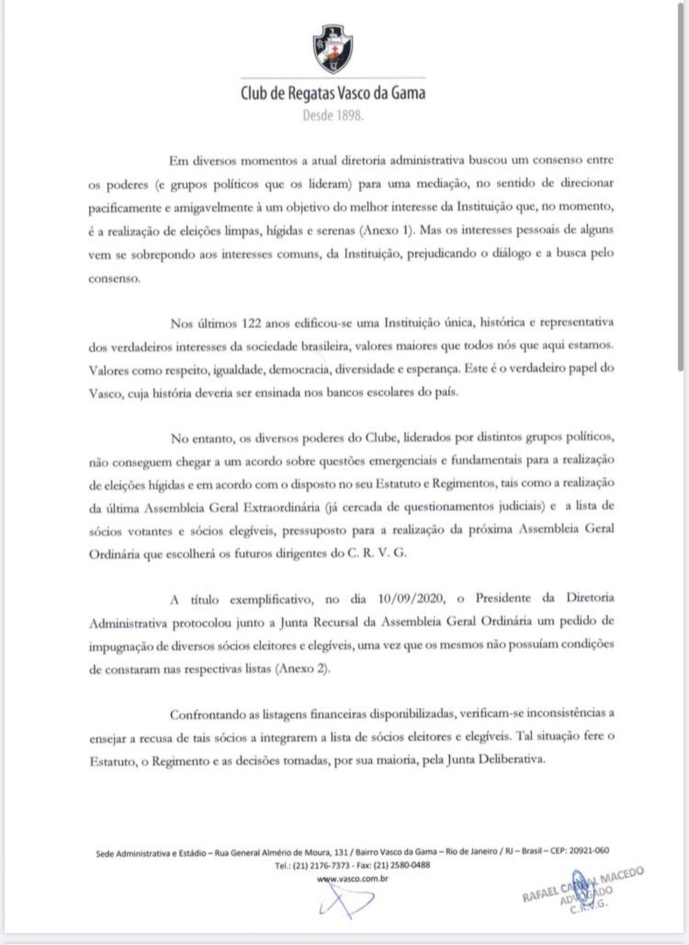 Campello protocola pedido de ajuda ao Ministério Público para acompanhar eleição do Vasco
