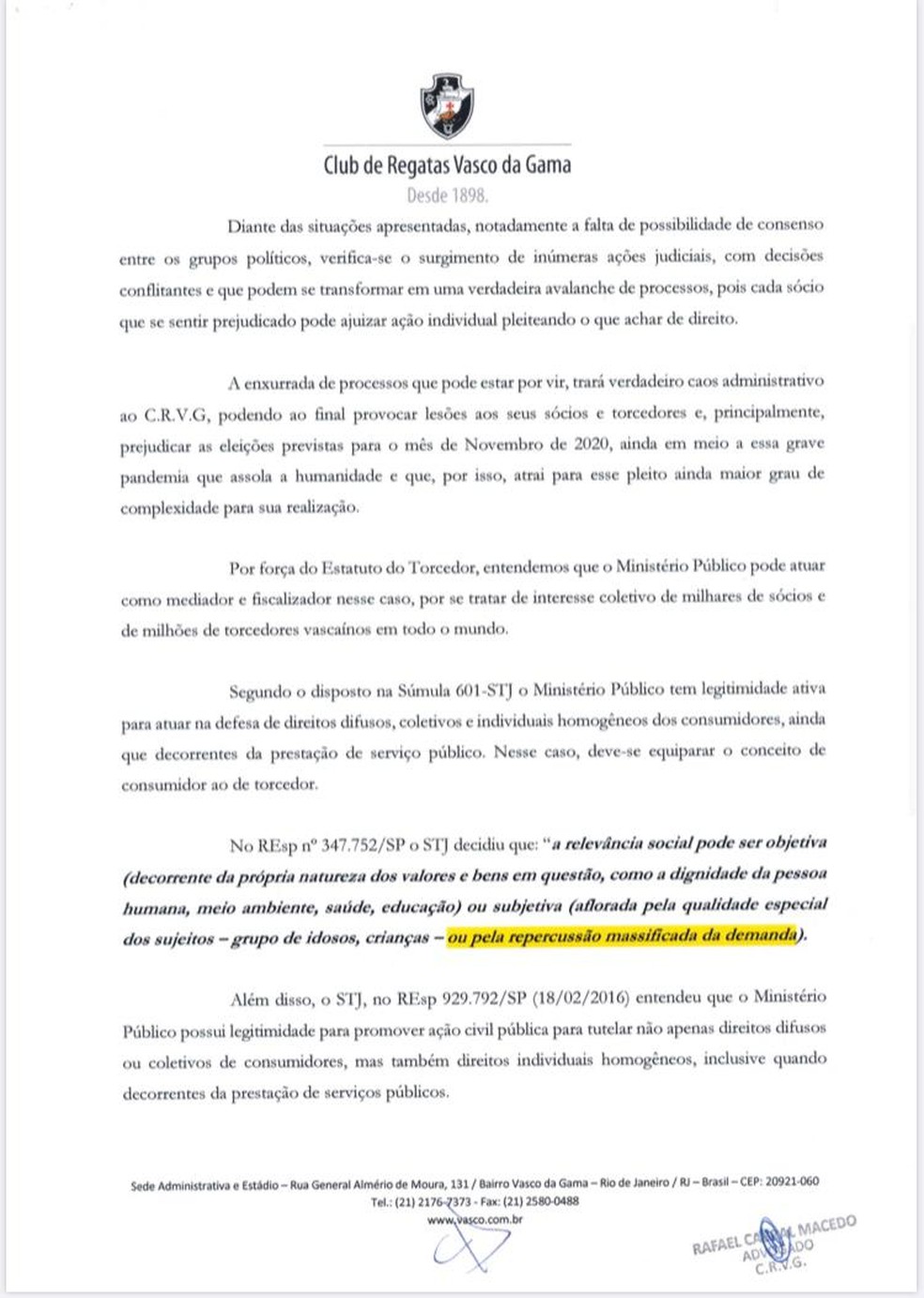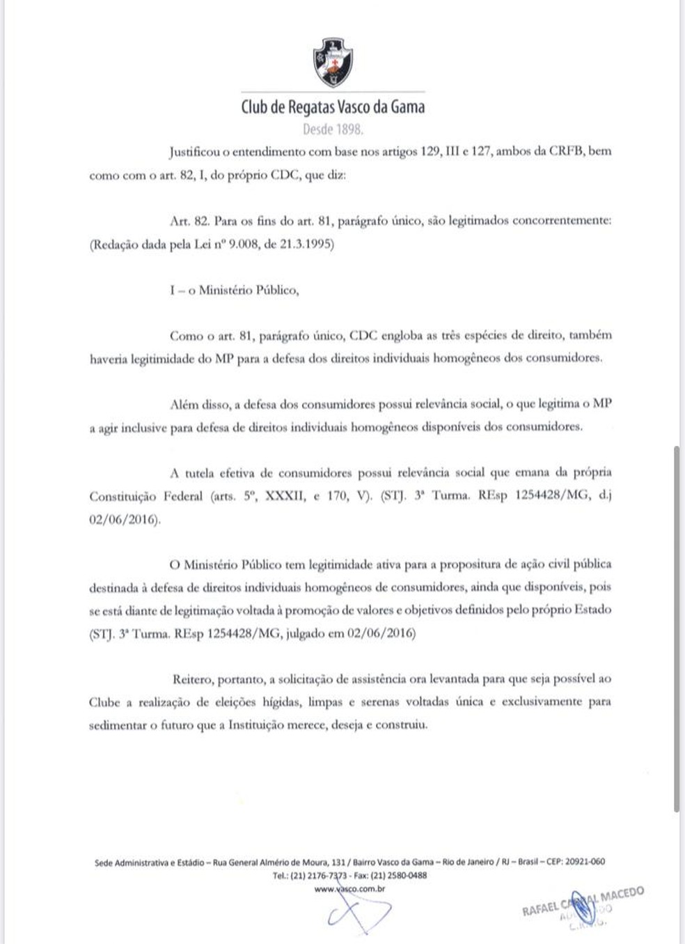 Segundo Campello, em contato com ge, a busca pelo auxílio do MP/RJ se dá por conta do conturbado processo eleitoral e pela "falta de isenção das pessoas que participaram do processo". O dirigente citou nominalmente o presidente da Assembleia Geral do Vasco, Faus Jassus, o Mussa.