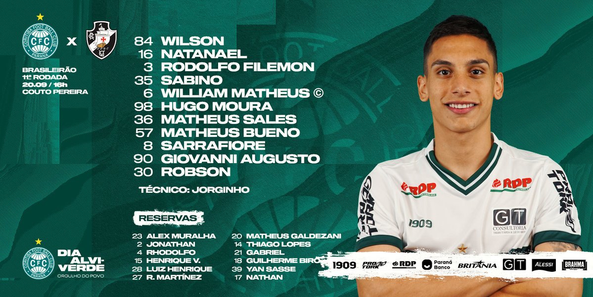 Veja a escalação do Coritiba para o jogo contra o Vasco; ex-vascaínos William Matheus e Giovanni Augusto são titulares