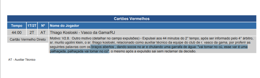 "Expulsei aos 44 minutos do segundo tempo, após ser informado pelo quatro árbitro, sr. Murilo Ugolini Klein, relacionado como auxiliar técnico da equipe do Club de Regatas Vasco da Gama por proferir as seguintes palavras com os braços abertos, dando socos no ar e chutando uma garrafa de água: "Vai tomar no cu, esse var é uma palhaçada, palhaçada, vai tomar no cu". O mesmo após a expulsão sai sem reclamar".