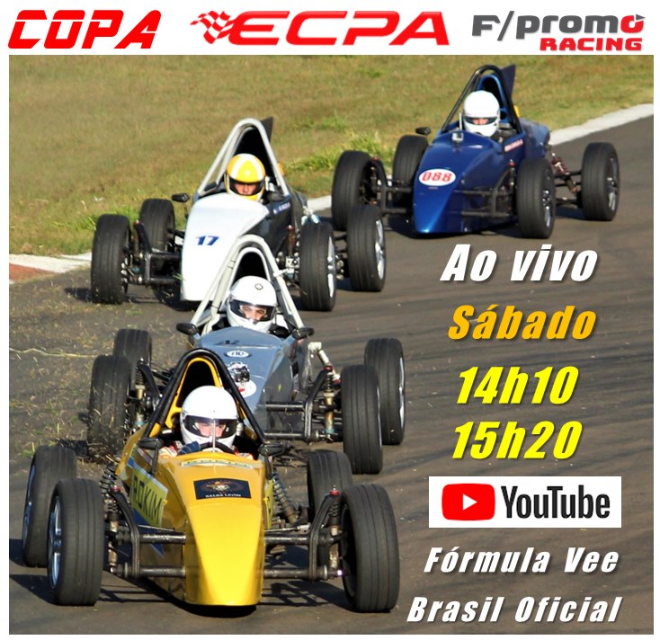 Assista às provas da 2ª etapa da Copa ECPA F/Promo Racing neste sábado (26/9), ao vivo no canal Fórmula Vee Brasil Oficial no YouTube: largada da Elite 1 (a 1ª bateria), às 14h10; largada da Elite 2 (a 2ª bateria), às 15h20.