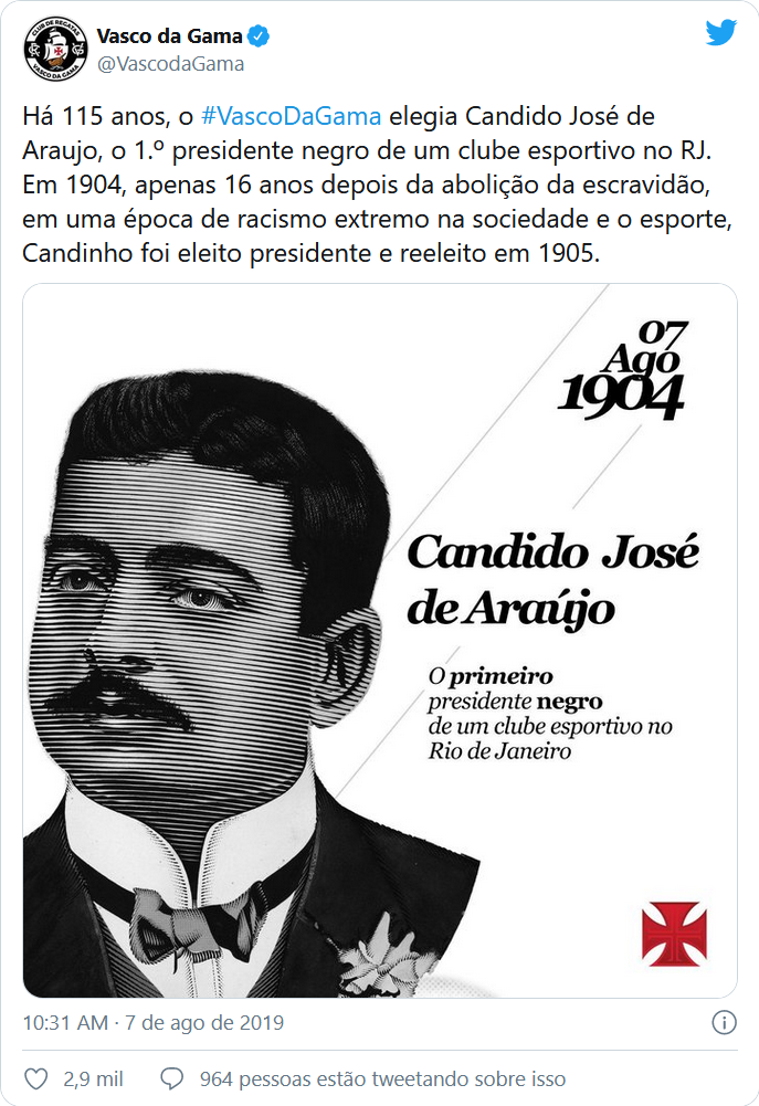 Ano passado, completaram-se 115 anos da eleição de Candinho e o Vasco o homenageou com uma postagem no Twitter oficial do clube: