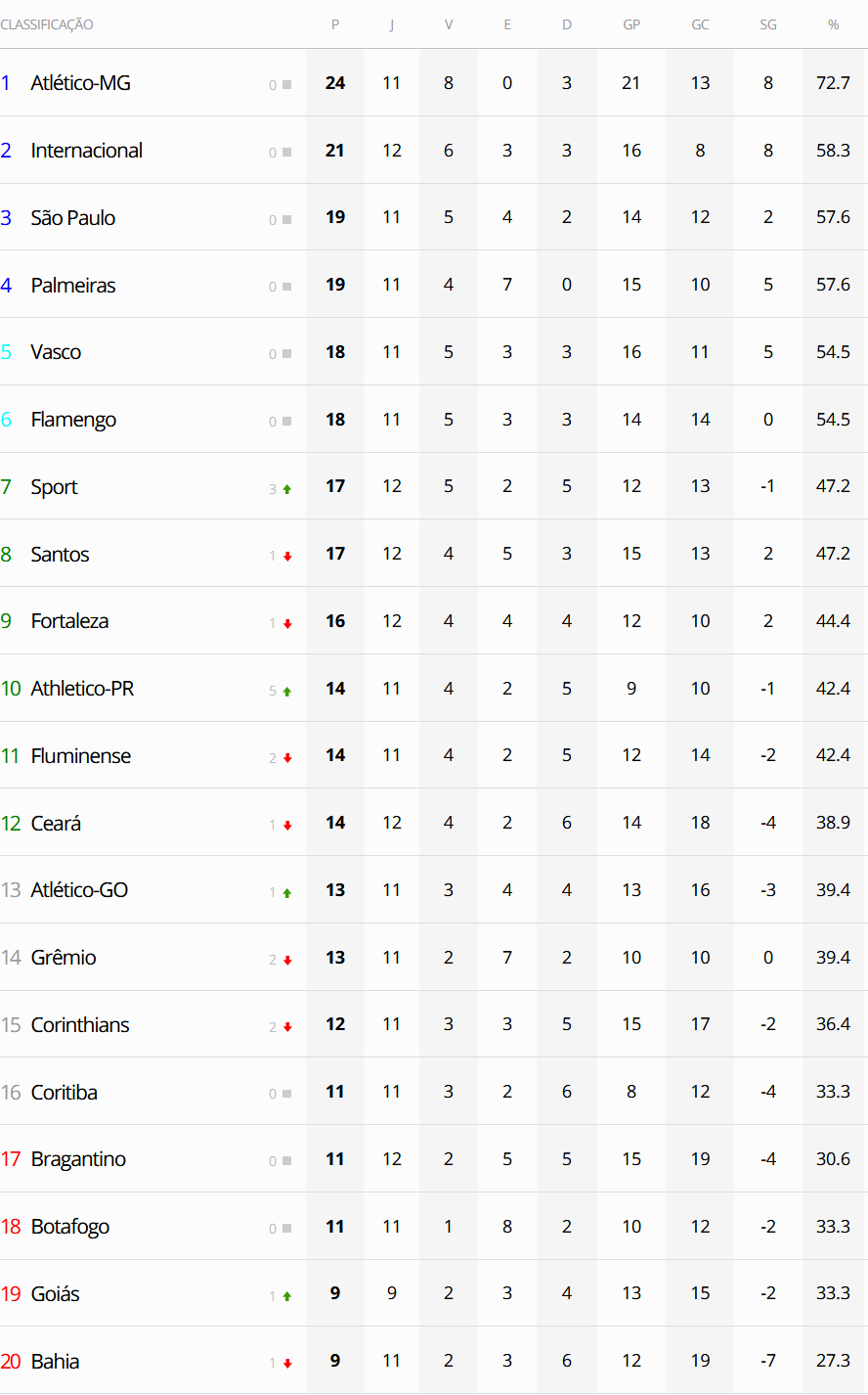 Terminados os jogos deste domingo da 12ª rodada do Campeonato Brasileiro, o Vasco, que empatou com o Red Bull Bragantino por 1 a 1, segue na 5ª colocação da competição. O jogo Fluminense x Coritiba encerra a rodada nesta segunda-feira, mas o resultado não modificará a posição do Vasco na tabela. O Gigante da Colina tem o jogo contra o Palmeiras, válido pela 1ª rodada, ainda a disputar.