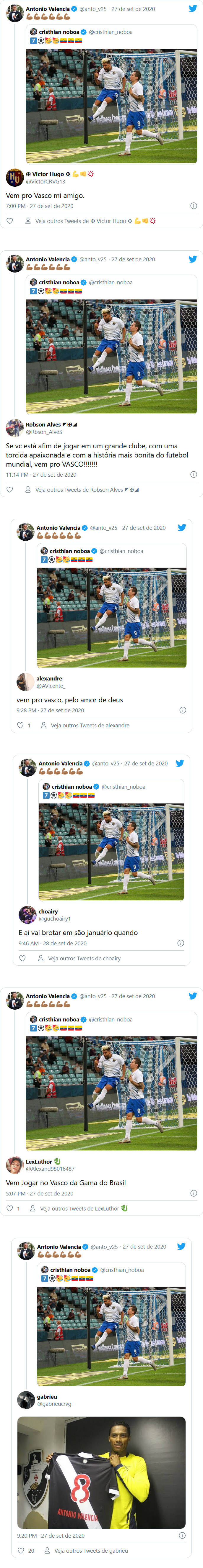 O experiente lateral-direito Antonio Valencia virou alvo de torcedores do Vasco nas redes sociais. O jogador está sem clube e vem treinando por conta própria desde que deixou a LDU, do Equador. De acordo com o canal "Atenção, Vascaínos", o clube carioca tem o atleta na mira, mas ainda não há negociação.