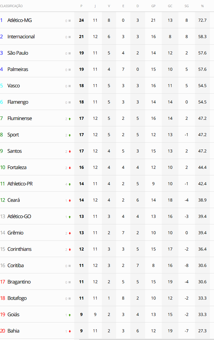 Terminados os jogos da 12ª rodada do Campeonato Brasileiro, o Vasco, que empatou com o Red Bull Bragantino por 1 a 1, segue na 5ª colocação da competição. O Gigante da Colina tem o jogo contra o Palmeiras, válido pela 1ª rodada, ainda a disputar.