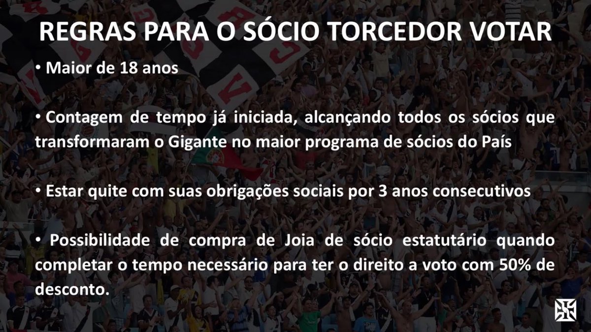 "A gente tomando posse, logo no primeiro semestre, vamos trabalhar um projeto de reforma do estatuto que permita ao sócio-torcedor o direito a voto".